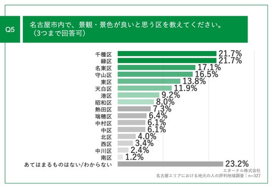 「Q5.名古屋市内で、景観・景色が良いと思う区を教えてください。(3つまで回答可)」(n=327)と質問したところ、「千種区」が21.7%、「緑区」が21.7%、「名東区」が17.1%という回答となりました。