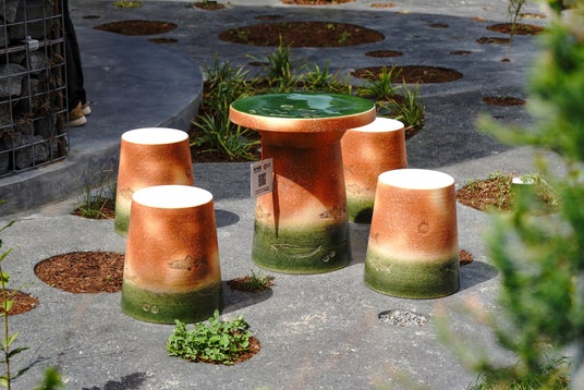 窯業系廃棄物のリサイクル資源化と琵琶湖の生き物をモチーフにデジタル技術を活用し、多様な対話や文化の共創に繋がるアップサイクル製品として、陶製テーブルスツールを開発し、万博会場に提供。