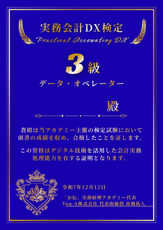 各級のクエストをクリアした受講生には、You-A株式会社がその実務能力を保証する「認定証」を発行します。 また、認定証には合否だけでなく、「入力速度」「正確性」「ツールの活用度」などを数値化した「実務スキル分析シート(診断書)」を付帯させます。これにより、単なる肩書きではなく、「その人が現場で『何ができるか』」を客観的に証明します。