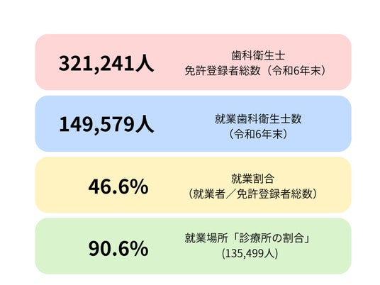 厚生労働省の「令和6年 衛生行政報告例(就業医療関係者)」結果として、日本歯科衛生士会は、令和6年末の就業歯科衛生士数が149,579人(約15万人)であると公表しています(前回・令和4年末145,183人から4,396人増)。また就業場所別では、診療所が135,499人(90.6%)と大半を占めています。