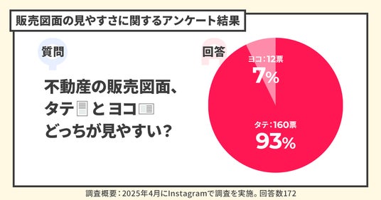 実際にInstagram上でアンケートを実施した結果、172名の方にご回答いただき、図面の見やすさについて93%にあたる160票が「縦型の方が見やすい」と回答する結果となりました。横型の販売図面では、スマートフォン画面を左右にスクロールしなければ全体を把握することが難しいという課題がありましたが、縦型販売図面では、画面を上下にスクロールするだけで物件の全体像をスムーズに確認することが可能です。