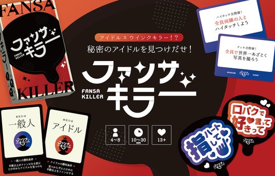 『ファンサキラー』は、プレイヤーの中に紛れ込んだアイドル役を、他のプレイヤー(一般人役)が"ファンにならないように"見つけ出す、ドキドキ感と盛り上がりが融合した新感覚の正体隠匿型ゲームです。