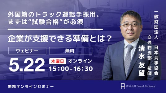 昨年12月、国内で初めて運送業界の特定技能試験を主催する一般財団法人 日本海事協会と共同で試験を実施。2025年5月22日(木)には、外国人トラックドライバーの採用を検討している企業様向けに、試験対策・社内研修体制の構築方法に関するセミナーを開催します。