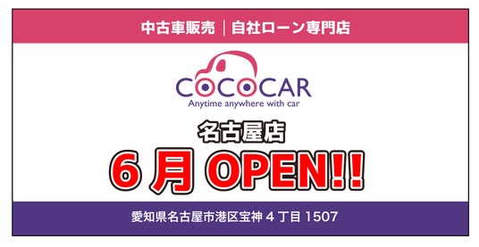 自社ローン専門の中古車販売店として信用情報機関を通さない独自の審査をすることで、オートローン審査が通らない人でも分割支払で車が買える販売サービスを提供している「COCOCAR」は、東北地域3店舗(盛岡店、仙台店、福島店)・関東地域2店舗(加須店、酒々井店)・北海道(FC札幌店)に店舗展開をしており、今回東海エリアで初めての「COCOCAR名古屋店」を出店いたします。