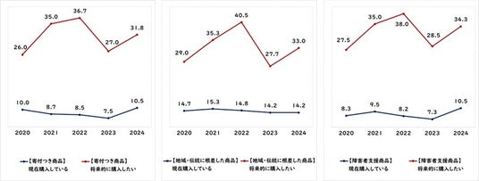 ソーシャルプロダクツの購入について質問したところ、2024年の調査結果においていずれかのソーシャルプロダクツ(「フェアトレード商品」「オーガニック商品」「エコ商品」「寄付つき商品」「地域や伝統に根ざした商品」「障害者支援商品」「復興支援商品」)の購入を「現在行っている」回答率は38.5%でした。その中でもトップ3は、第1位「エコ商品の購入」(24%)、第2位「オーガニック商品」(17.5%)、第3位「地域・伝統に根差した商品」(14.2%)でした。