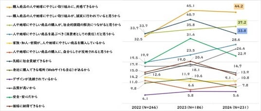 2022年対2024年において回答率が増加したトップ3は、第1位「購入商品の人や地球にやさしい取り組みに、共感できるから」(11.7ポイント増)、第2位「人や地球にやさしい商品を選ぶべき(消費者としての責任)だと思うから」(8.7ポイント増)、第3位「購入商品の人や地球にやさしい取り組みが、誠実に行われていると思うから」(8.5ポイント増)でした。これらの結果から、人や地球にやさしい取り組みに対する印象や評価が商品選択の理由になる生活者が増加傾向にあると考えられます。