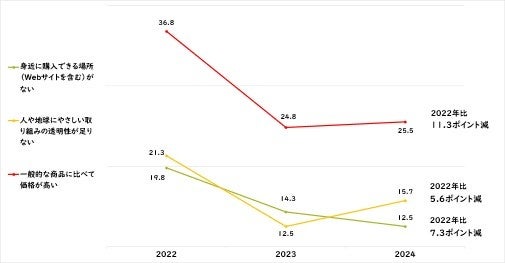 2022年対2024年において回答率が低下したトップ3は、第1位「一般的な商品に比べて価格が高い」(11.3ポイント減)、第2位「身近に購入できる場所(Webサイトを含む)がない」(7.3ポイント減)、第3位「人や地球にやさしい取り組みの透明性が足りない」(5.6ポイント減)でした。