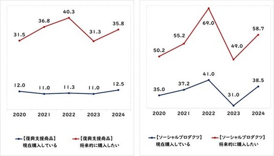 2020年時点では「SDGs」の認知率は50%でしたが、2021年以降は80%前後となり、認知率の大幅な増加が見られます。また「ソーシャルプロダクツ」の認知率も、2020年では36.2%だったものが2024年では58.3%となり、SDGsに次ぐ増加幅となっています。