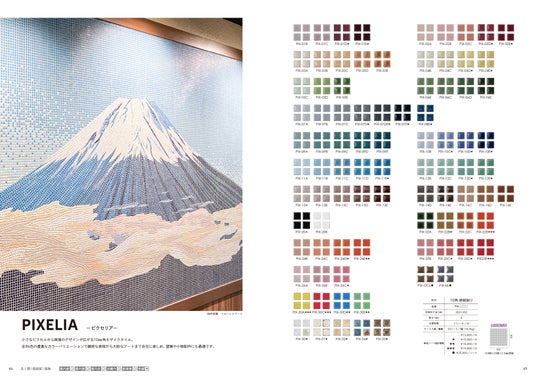 初掲載製品:細かなタイルアートに最適な10mm角モザイクタイル「ピクセリア」や、タイル表面と同じ模様を小口に施したフロアータイル「エイシェント」など、既存ラインナップを一層充実。