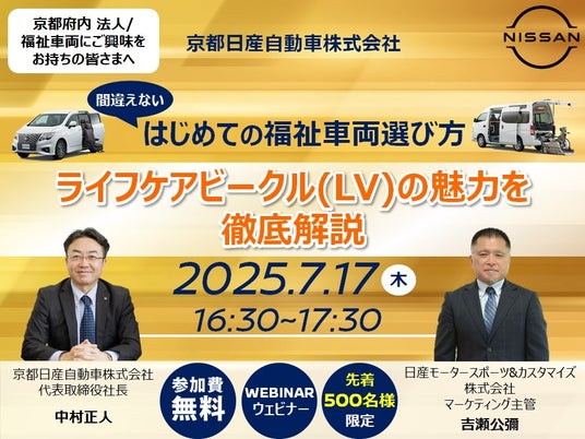 日産モータースポーツ&カスタマイズ(株)のマーケティング主管である吉瀬氏を交えて、京都府内の法人・個人の皆さまにオンラインセミナー「はじめての福祉車両の選び方 ライフケアビークル(LV)の魅力を徹底解説」を開催することをお知らせします。