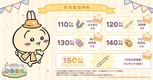 事前登録者数が150万人を突破し、『ちいぽけ』サービス開始時に特典として公開していた全てのアプリ内アイテムの配布が決定いたしました。本アイテムは、「討伐」や「草むしり」などのコンテンツで役に立つものとなります。また、『ちいぽけ』のアニメーションLINEスタンプの配布およびリアルグッズのプレゼントキャンペーン開催については、アプリ配信開始後に順次ご案内いたします。
