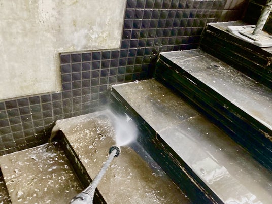 まずは、下地の汚れをしっかり洗い落とし、防水材の密着性を高めるための洗浄作業を行いました。