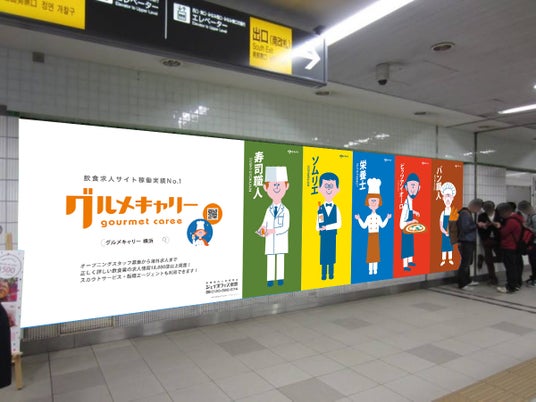 株式会社ジェイオフィス東京が運営する飲食業界専門の求人サイト『グルメキャリー』は、認知拡大プロモーションの一環として、ゴールデンウィーク期間中に横浜駅構内の看板・デジタルサイネージにて大規模プロモーションを実施します。イラストレーター、Cozy Tomato氏が描く”飲食業で働く夢をかなえる魔法使い キャリーちゃん"と飲食の職業キャラクター11体が横浜駅を躍動し飲食業界で働く楽しさをポジティブに伝えていきます。