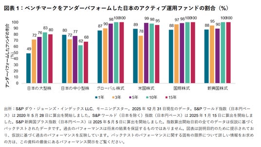 S&P ダウ・ジョーンズ・インデックスの指数投資戦略のアジア太平洋地域のヘッドであるSue Leeは以下のように述べています。「2025年は、日本のアクティブ運用マネージャーにとって厳しい投資環境となり、6つのファンド・カテゴリーのうち5つのカテゴリーにおいて、80%以上のアクティブ運用ファンドが各々のベンチマークをアンダーパフォームしました。もっとも、日本の大型株カテゴリーは例外となり、ベンチマークをアウトパフォームしたファンドがわずかに過半数を超え、2017年以降で最高の相対パフォーマンスとなりました。ただし、長期的には依然として厳しい状況が続いています。2025年12月末までの15年間では、全てのカテゴリーにおいて大多数のアクティブ運用ファンドがベンチマークをアンダーパフォームしました。」