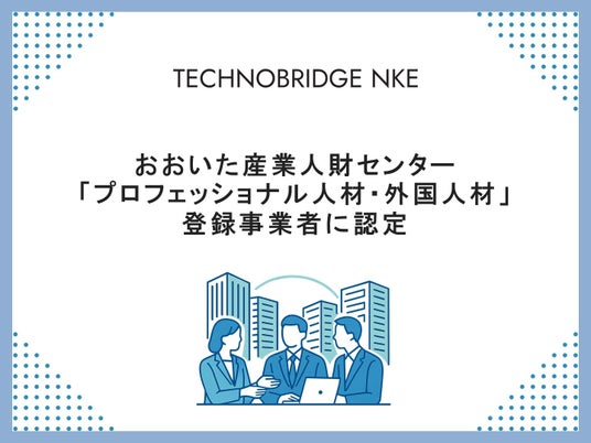 土木・建築分野で幅広いエンジニアリングサービスを展開するテクノブリッジNKE株式会社(本社:東京都千代田区、代表取締役:田中 宏和)は、大分県の「おおいた産業人財センター(おおいたジョブステーション)」において実施されている、プロフェッショナル人材・高度外国人材とのマッチング事業に関し、登録民間人材ビジネス事業者として認定されたことをお知らせします。