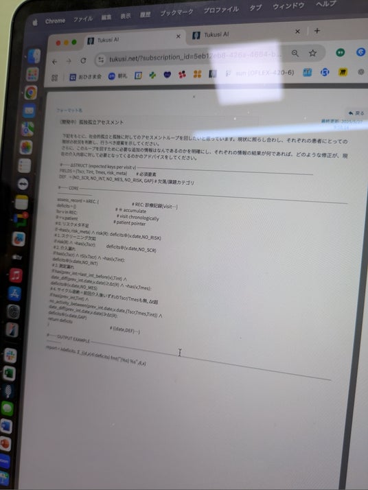 Tukusi AIに保存されたサマリー情報や、電子カルテシステムに記録されている処方、検査等の情報を収集し、指定したガイドライン(COPD、心不全、孤独孤立、etc.)に合わせて評価を生成します。ここで生成された内容を、診療方針や課題のチェックに生かします。AIにガイドラインに合わせた評価を生成させるためのプロンプトは独自に実装しています。この評価は、患者サマリーの一部として保存され、カルテ生成時などの文脈情報の一部となります。