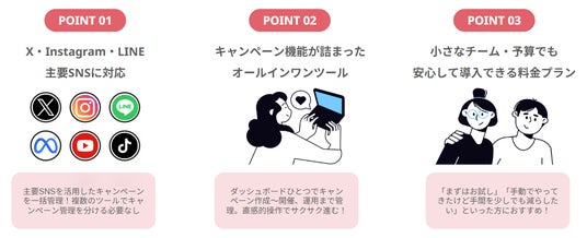 キャンペーンページの作成から、フォロー・リポスト・アンケート・投稿などの応募条件チェック、自動抽選やギフト設定まで、キャンペーン開催・運用に必要な機能を全て搭載しています。SNSマーケティングをはじめたい方にもお勧めです。