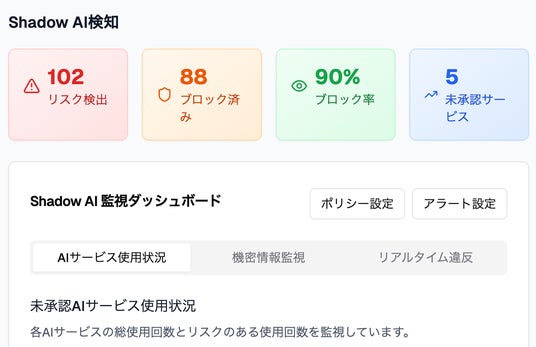 従業員が未承認の生成 AIサービス(ChatGPT、Gemini 等)を利用していないかを自動検知し、アクセスをブロック/可視化。