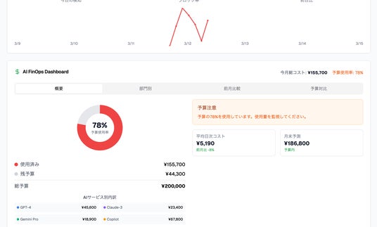 モデルごとのトークン使用量とAPI課金をリアルタイム監視し、予算超過をアラート。部門別チャージバックにも対応。