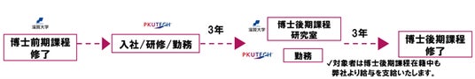 本プログラムでは、滋賀大学博士前期課程修了者を採用し、PKUTECHにおける一定の勤務を経て、滋賀大学の博士後期課程の入学試験(社会人)に合格の後に、PKUTECHに在籍しながら博士後期課程に進学することが可能です。博士後期課程にはPKUTECHより派遣し、費用はPKUTECHが負担いたします。本プログラムの実施により、優秀な博士前期課程修了者の採用とPKUTECHの更なる研究力並びに技術の向上を実現します。