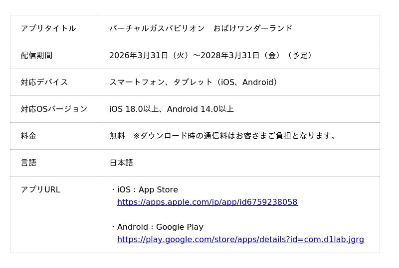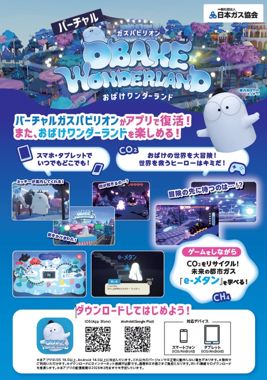 当協会はこのたび、二酸化炭素をリサイクルしてつくる未来の都市ガス「e-メタン」や、都市ガス業界のカーボンニュートラルに向けた取り組みの認知度向上を目的として、「バーチャルガスパビリオン おばけワンダーランド」の体験内容をそのままに独自でアプリ化し、本日より、App StoreとGoogle Playにて公開しました。