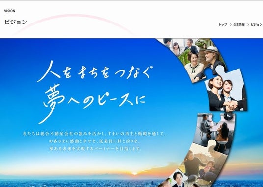 当社は、総合不動産会社の強みを活かし、すまいの再生と循環を通して、お客さまに感動と幸せを、従業員に絆と誇りを、夢ある未来を実現するパートナーを目指してまいります。