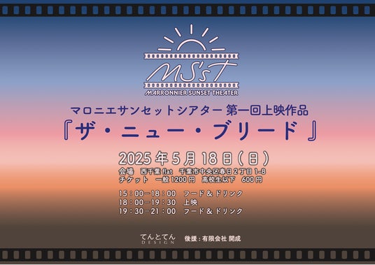てんとてんデザイン(東京都渋谷区)と有限会社開成(千葉県千葉市)は西千葉のマロニエ通りにある西千葉フラットにて『マロニエサンセットシアター』を5月18日から毎月1回開催します。夕暮れ時にドキュメント映画と対話のひとときを提供いたします。