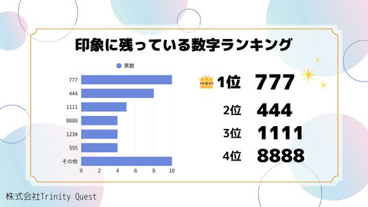 調査の結果、71%が「同じ数字をよく見ることがある」と回答し、また印象に残っている数字として “777”“444”“1111” などのいわゆるエンジェルナンバーが上位を占めました。