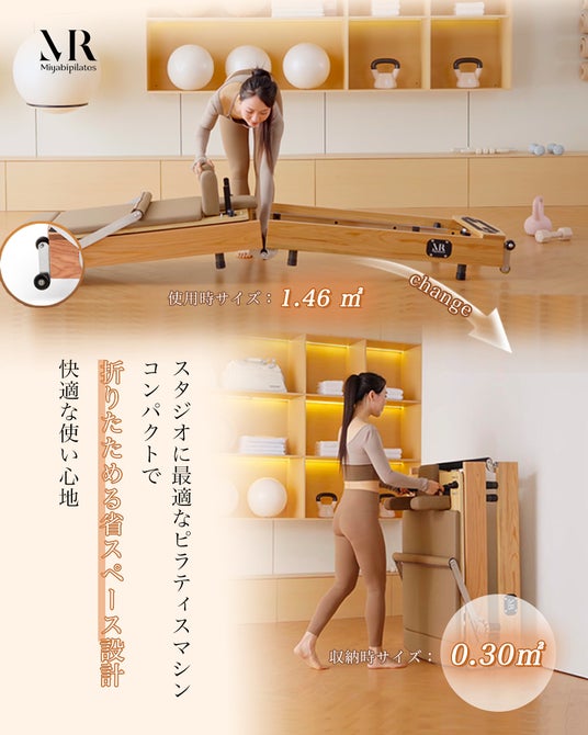 【雲シリーズ】よりコンパクトかつ導入しやすい折りたたみ式リフォーマーシリーズです。 スタジオや整体院、ヨガスタジオに加え、ご自宅用機器としても高い人気を誇り、導入実績が拡大しております。Miyabi公式のAmazonストアでも取り扱っており、多くのお客様から高評価のレビューをいただいています。