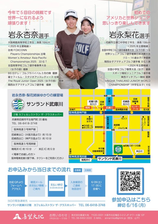 株式会社喜望大地(本社:大阪市北区)は、スポンサーを務めるアマチュアゴルファー岩永杏奈選手・梨花選手の「世界ジュニアゴルフ選手権・日本女子アマ」出場を祝い、渡米前の両選手を激励するイベント「岩永杏奈選手&梨花選手世界ジュニアゴルフ選手権日本女子アマ出場祝賀会」を2025年6月28日(土)に開催します。