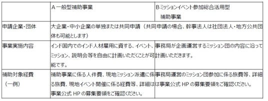 ミッション派遣の時期や都市設定、訪問先等を独自に計画する企業・団体向け事業(以下、「A一般型補助事業」と言う。)の他、独自に計画することは困難であるが、事務局が企画・運営するミッション団への参加を通じて、積極的にインド人材の雇用を目指す企業・団体向け事業(以下、「Bミッションイベント参加総合活用型補助事業」と言う。)も対象とします。