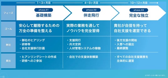 本サービスでは、ヒアリング、移行計画の策定、研修、支援業務への同行、月次定例、入管への届出対応、運用定着までを段階的に支援し、企業が無理なく自社支援へ移行できる体制づくりをサポートします。資料では、基礎構築、伴走飛行、完全な独立の3フェーズで支援する設計が示されています。