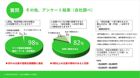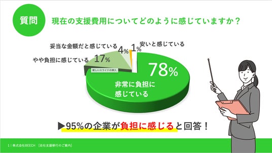 株式会社BEECHが実施した独自のアンケートでは、現在の支援費を「負担に感じる」と回答した企業は95%にのぼりました。また、99%の企業が登録支援機関に支援を委託している一方で、9割以上の企業が「自社支援への切り替えに興味がある」と回答しています。