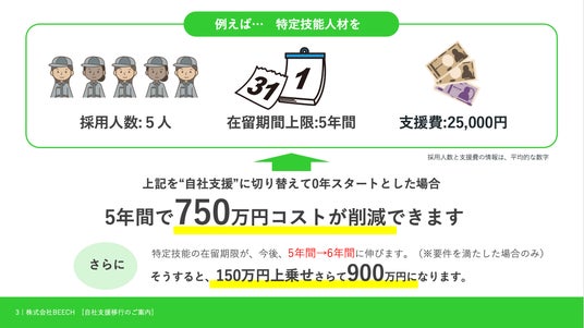 株式会社BEECH(本社:兵庫県神戸市、代表取締役:池田哲也)は、特定技能外国人を雇用する企業向けに、登録支援機関への委託から自社支援への切り替えを支援する「自社支援移行コンサルティング」を2026年3月1日より開始しました。※全国対応可