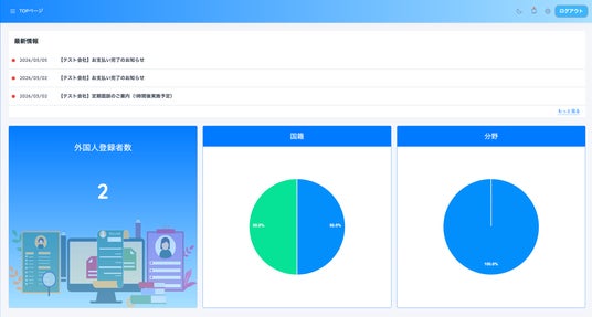 本システムでは、人材情報、申請関連業務、定期面談の管理を一元化することで、支援業務の効率化と担当者負担の軽減を図ります。加えて、制度改定や運用上必要な情報を「お知らせ」機能で共有することで、情報把握の漏れを防ぎ、企業が適切かつ円滑に自社支援を運用できる環境を支援します。なお、本システムは単体販売ではなく、自社支援移行コンサルティングの導入企業に対するオプションとして提供し、導入企業は永久無料で利用可能です。
