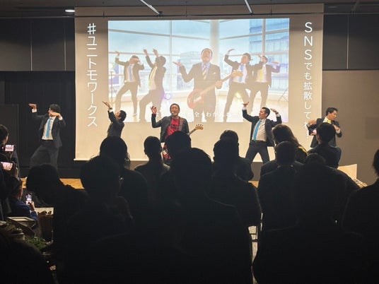 イベント冒頭では、当社のコーポレートキャラクターを務めていただいているはなわさんが、当社のために作詞作曲いただいた「ユニトモワークスのうた」を生披露。社員一同もバックダンサーとして登壇し、会場は大きな盛り上がりを見せました。