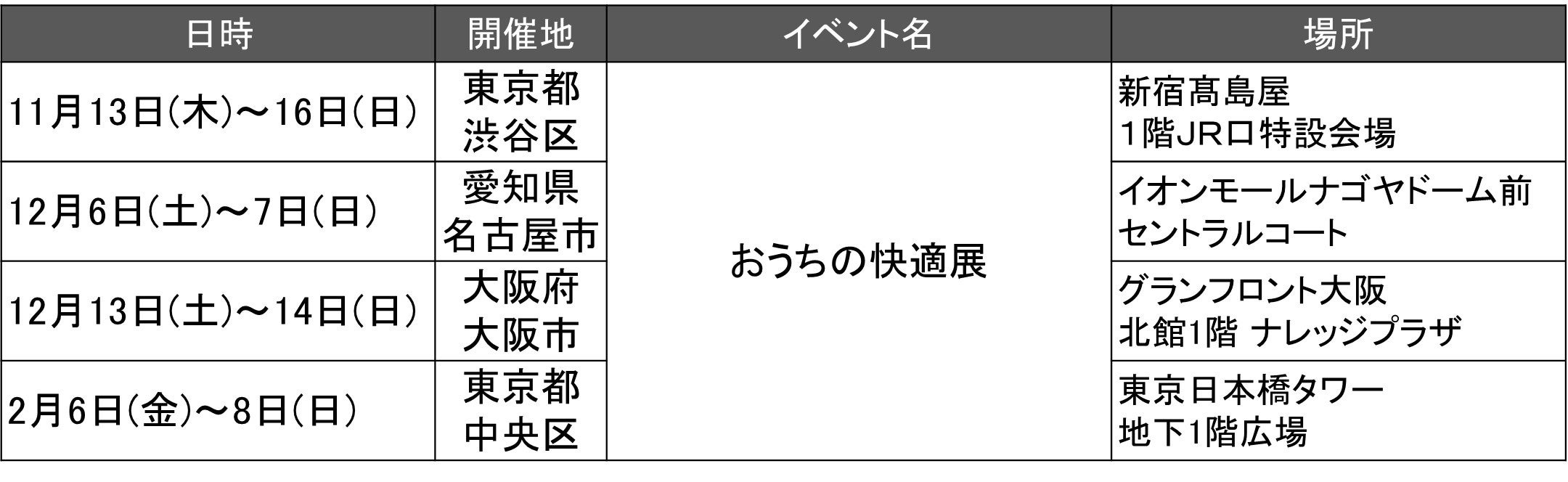 東京・大阪・名古屋では、断熱・省エネリフォーム推進タスクフォースが主催する、暮らしの快適性を見つめ直す体験型イベント「おうちの快適展」を行います。今回の新宿会場での開催を皮切りに、名古屋・大阪・東京日本橋の計4会場で順次実施予定です。