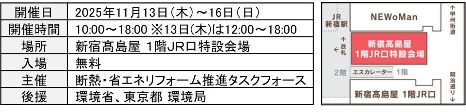 その取り組みの一環として、暮らしの快適性を見つめ直す体験型イベント『おうちの快適展 ~不快は、断熱で快適にできる~』を、2025年11月13日(木)~16日(日)、新宿高島屋 1階JR口特設会場で開催します。リフォームや断熱関連のニーズが顕在化していない層、特に戸建て所有者およびファミリー層に向けて、断熱リフォームへの気づきと必要性の理解を促進してもらうための、コンテンツを出展します。