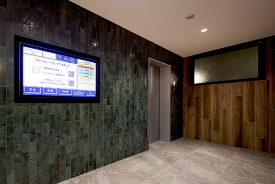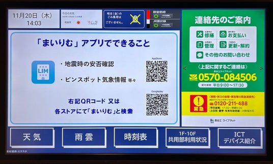エレベーターホール モニターに24時間対応窓口の連絡先を掲示