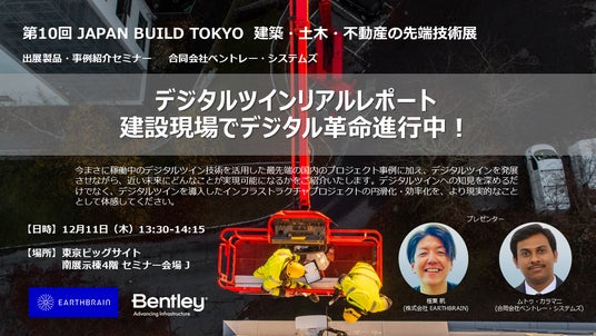 合同会社ベントレー・システムズ(本社:アメリカ合衆国、CEO:ニコラス・カミンズ)は12月10日(水)~12日(金)に東京ビッグサイトにて開催される、第10回 JAPAN BUILD TOKYOに出展いたします。会期2日目の12月11日(木)は、「出展製品・事例紹介セミナー」にて講演いたします。