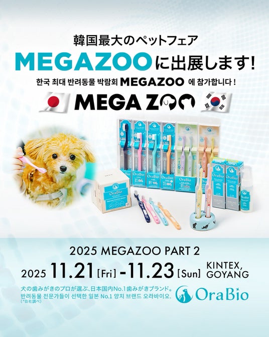 株式会社ハミガキドッグ(本社:大阪市天王寺区/代表取締役:山田あや)は、弊社グループが展開する犬の口腔ケアブランド「OraBio (オーラバイオ)」が、2025年11月21日(金)~23日(日)に韓国・KINTEXで開催される韓国最大級のペットフェア「MEGAZOO」に初出展することをお知らせいたします。