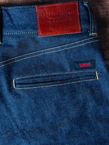 デニムには珍しい袋ポケット。最深部で約21cmと深めに設計。中の布(スレキ)がお尻に追従し長時間ライドになるほど効果を発揮。