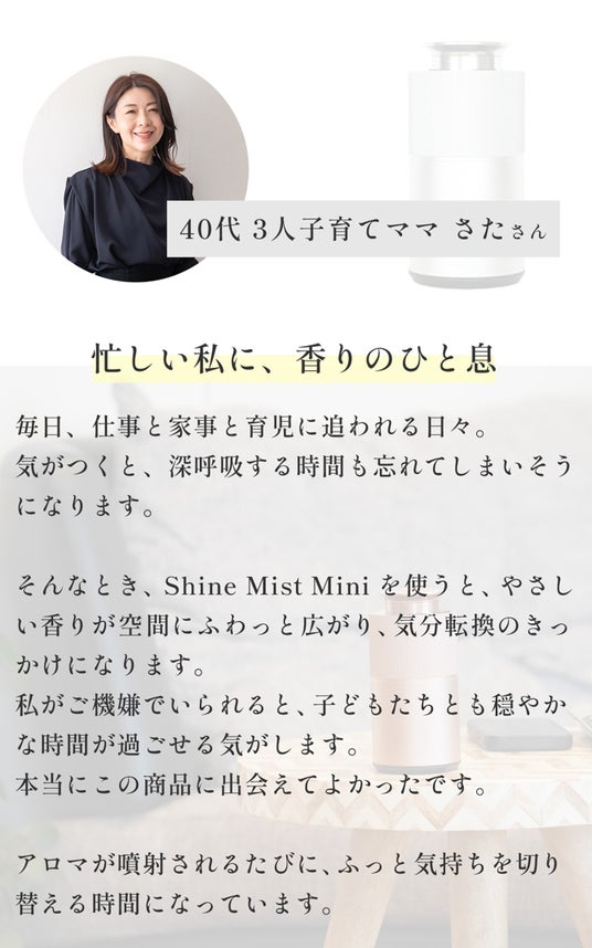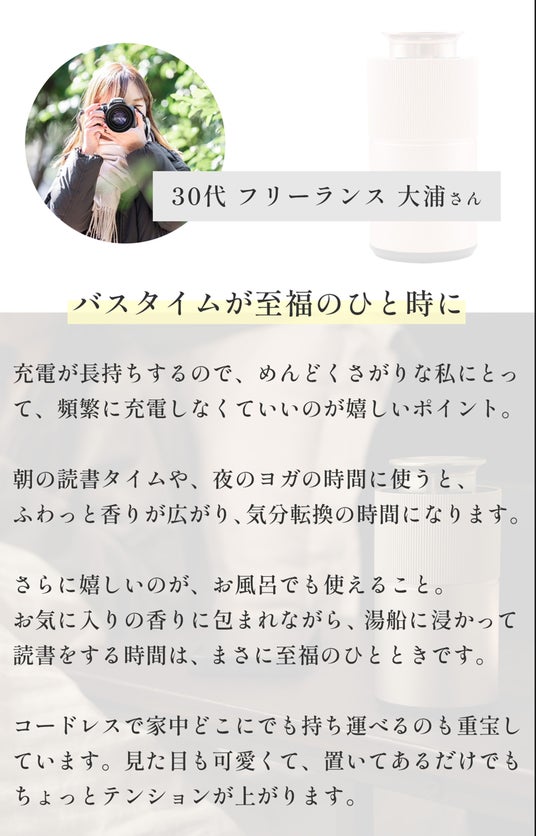 SNS疲れや情報過多の現代人に、“香りで思考を手放す時間”を提案。防湿設計×コードレスで場所を選ばず使える、新しいセルフケア習慣を届けます。