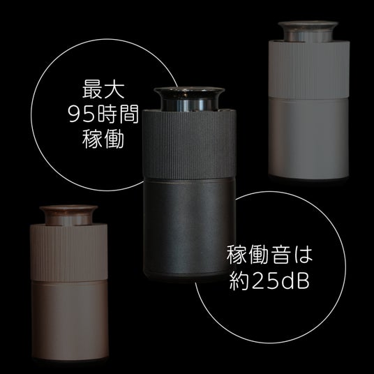 さらに、コードレス設計により場所を選ばず、最大95時間の連続稼働・約25dBの静音性を実現。日常のあらゆる空間に自然に香りを届けます。
