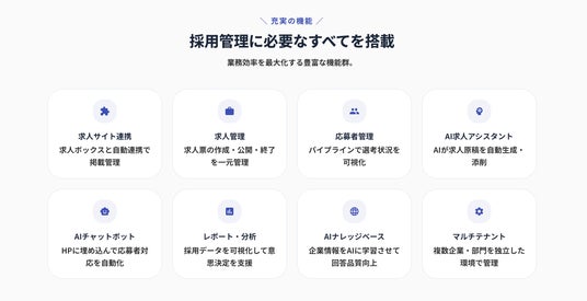 「採用業務から気軽に始めるDX」をコンセプトに、AI×採用で、採用管理に必要な機能をまとめて搭載した次世代ATSです。