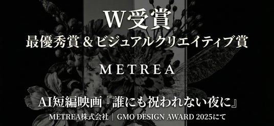 クリエイティブAIを活用したコンテンツ制作およびAIリスキリング研修事業を展開するMETREA株式会社(本社:東京都新宿区、代表取締役CEO:平田 茉莉花、以下 METREA)は、当社が制作したAI短編映画『誰にも祝われない夜に』が、GMOインターネットグループ株式会社主催の「GMO DESIGN AWARD 2025」において、コンテスト最高賞である「最優秀賞」および「ビジュアルクリエイティブ賞」の2冠を受賞いたしましたことをお知らせいたします。