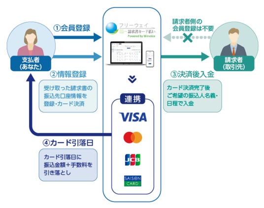 - サービス内容: 銀行振込指定の請求書をカード決済(Visa/Mastercard/JCB/American Express)に切り替え、サービス運営会社がお客様に代わって振込を行うサービス。