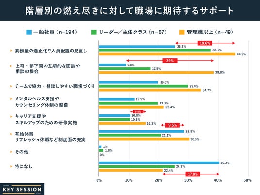 「メンタルヘルス支援やカウンセリング体制」が燃え尽き層では25.7%、非燃え尽き層では8.5%と17.2ポイントの違いがあります。現在燃え尽きている層は相当な疲労感を覚えており、まずはメンタルサポートを早急に用意する必要があるようです。