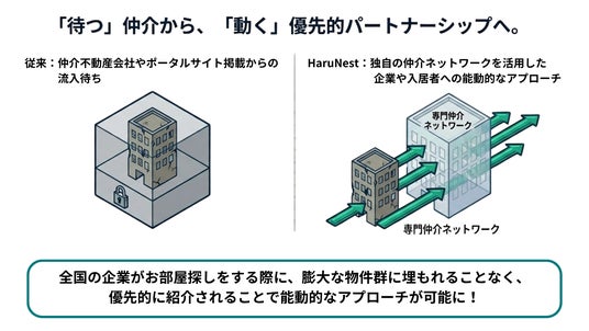 2.HaruNestの提供しているサービスを利用している全国の企業へ、優先して当該オーナーの既存物件を紹介させていただきます。