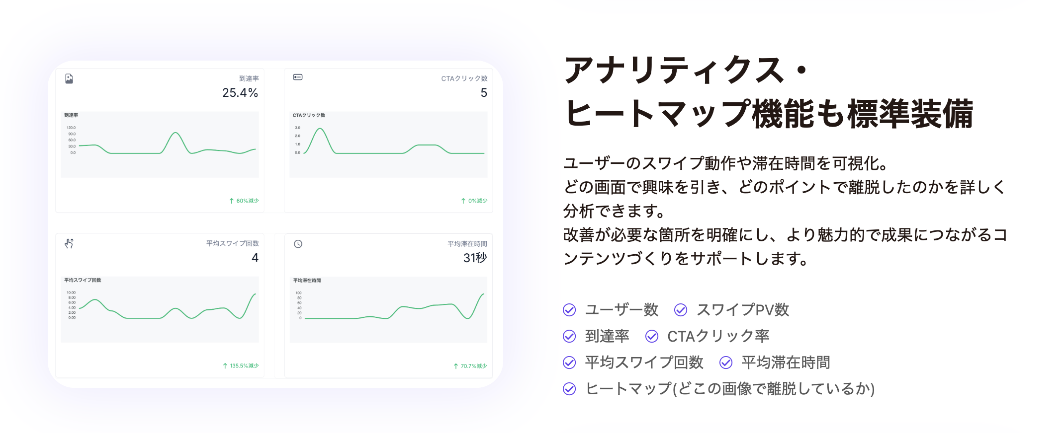 分析機能も、スワイプ数・滞在時間など“見るだけで分かる”簡易ダッシュボードを採用。